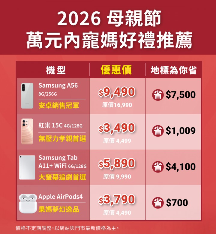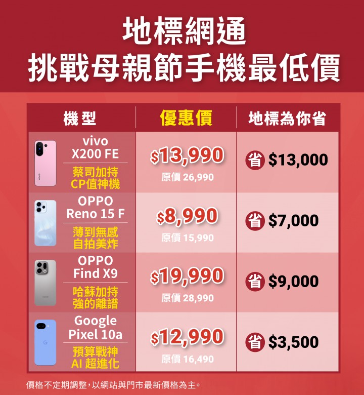 母親節購機熱潮開跑,行動裝置零售連鎖品牌地標網通即日起推出「挑戰母親節手機最低價」寵媽專案,精選 iPhone、三星、OPPO、vivo、Google 等多款熱門機型全面破盤。iPhone 系列比蘋果官網最高省下 7,910 元,安卓熱銷機更開出低於 5 折的驚人折扣。不只如此,5 月 31 日前購買任一 iPhone,地標網通獨家加碼贈送「第二年電池保固」(價值 $1,080),還免費資料轉移讓媽媽無痛換機,子女送得放心,孝心不打折、荷包不失血! 地標網通為蘋果官方授權經銷商,手機保固與蘋果直營店完全相同,但價格更具競爭力。本次母親節檔期,iPhone 全系列空機售價調降,iPhone 15 128G 優惠價 $17,990,iPhone Air 512GB 優惠價 $35,990,iPhone 17 Pro Max 512GB 優惠價 $48,790,皆有顯著折扣。 安卓品牌方面,Samsung S26 Ultra 12G/512G 優惠價 $42,490,Samsung S25 Ultra 12G/256G 優惠價 $28,490,vivo X200 FE 優惠價 $13,990,OPPO Find X9 優惠價 $19,990,Google Pixel 10a 優惠價 $12,990,多款旗艦機型皆有破盤折扣。 此外,地標網通也推薦萬元以下高 CP 值精選禮物,包含 Samsung A56、OPPO Reno15 F、紅米 15C 等手機,以及 Apple iPad、Samsung Tab 系列平板,還有 Samsung Galaxy Watch8、Apple Watch SE 2、小米手環 10 等智慧穿戴裝置,以及 Apple AirPods 4、Samsung Galaxy Buds3 耳機。 地標網通強調,透過舊機回收與門號攜碼,可進一步降低購機成本,甚至有機會將 iPhone 17 0 元帶回家。全台近 50 家門市提供免費資料轉移與功能教學等一站式服務,讓消費者能輕鬆為媽媽挑選並換購新手機。