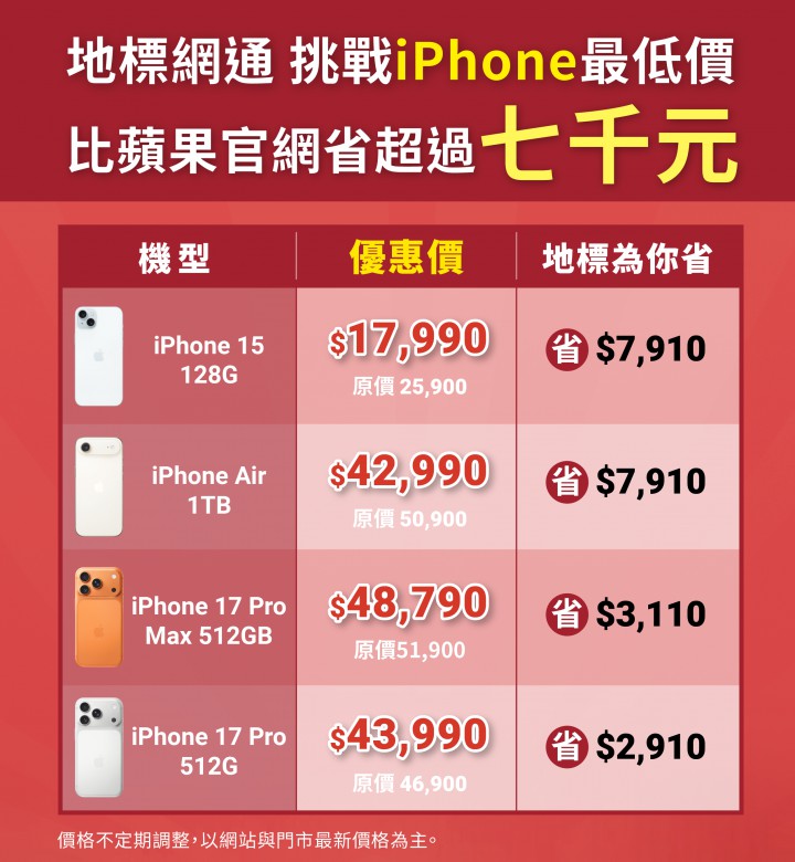 地標網通為蘋果官方授權經銷商,手機保固與蘋果直營店完全相同,不同的是,地標網通長期以「挑戰手機最低價」為顧客提供具價格競爭力的智慧 3C 產品。消費者購買同一型號 iPhone,在地標網通入手可以省下更多。本次母親節檔期,iPhone 全系列再度調降空機售價,最高省下金額相當驚人: