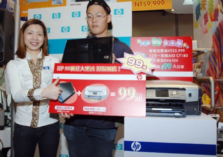 惠普影像列印暨消費通路事業群行銷專案經理游宜臻進一步表示:「本次資訊月人氣回溫,除了展場裡女性消費者的比例明顯增加,精品外型的耶誕雪花彩機詢問度創新高之外,HP的Officejet商用列印系列機種,因為有千元郵政禮券的實質回饋,也成為展期間的黑馬,全系列產品銷售成長率異軍突出達到200%! HP為回饋消費者的大力支持,決定閉展當日『99大樂透』活動現場將再加碼開放100名消費者排隊搶標,得標的民眾將可以99元的史上最低價格,帶回總價59,899元HP兩大最新旗艦機種:12合一Photosmart C7180多功能事務機及極至黑潮Pavilion DV6104筆記型電腦,現賺將近60,000元!為2006資訊月劃下完美的句點!」