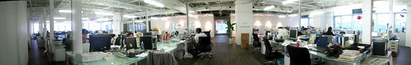 辦公區:這一區完全沒有任何隔間與天花板,102個位置完全看得見。最遠的同事在擠一隻新入手的玩具嘎嘎鴨,也不會遺漏。辦公桌完全訂製,並特別將桌面改為強化玻璃,讓設計師切切割割,也不會傷害桌面。工作區的設計挑戰則是在於「佈線」,因為沒有天花板和隔間,線路無從藏起,所以依每一桌的組數,設計師設計了修長的從天而降線柱,同時也是團隊識別的標誌。