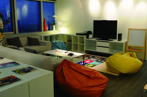 吧台、客廳、大會議區:這一區是華碩機構暨工業設計處的集合區,旁邊是大會議室,還有中央走道。完全沒有隔間的簡約設計,讓視覺更寬敞舒適,在吧台可以一眼看到客廳的電視,吧台後面的牆面是冰箱還有書櫃,符合居家生活裡,要吃要看的基本條件。所有的家具及懶骨頭都可隨意移動,隨時加上三張桌子,就變成下午茶活動區,加一張乒乓球桌,就變成運動區,加上一台投影機,就變成另一個開會的地方。