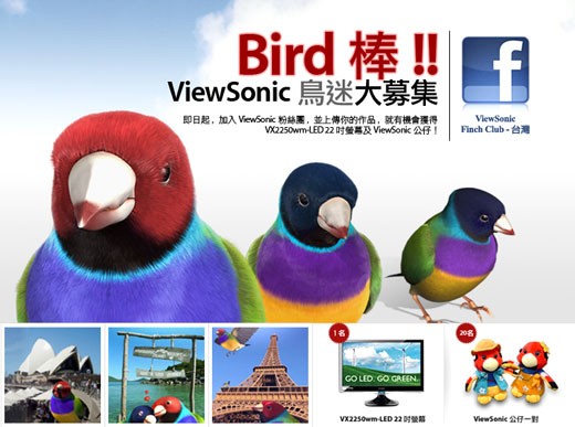 ViewSonic鳥迷俱樂部粉絲大募集!99/10/5~11/4期間,只要鳥迷參加粉絲大募集活動, 拍下最有創意的”今日最Bird棒”照片,上傳到ViewSonic Finch Club台灣臉書粉絲團,並寫下照片內容說明(1.為何喜愛拍攝的內容2.該如何愛護鳥類)獲得最多網友按”讚”支持熔臚@名粉絲即可獲得ViewSonic最新22吋LED液晶顯示器VX2250wm-LED一台! 另外,得票數前20名還可獲得ViewSonic限量超可愛小鳥公仔一對!機會難得~快來上傳你的創意鳥照片!