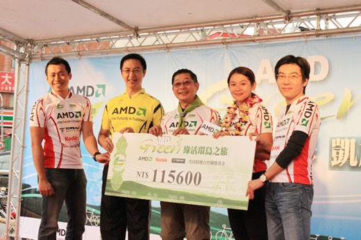 【AMD綠活環島之旅】首創以鐵馬作為行動SNG車,將台灣土地的美透過“AMD Green”萬人粉絲專頁-環島即時報導(電子書),分享給所有臉書粉絲。而參與此次旅程的夥伴,包括<練習曲>男主角東明相、3個公益團體、8處地方政府代表、近10支自行車隊共騎,同時也號召全台單車愛好者響應「騎一公里捐百元」作為生態關懷基金的概念。此環島活動於今日已正式進入尾聲,17天下來,共號召了全台上百名鐵馬車友一路接力環島陪騎,同時累積里程達1156公里,台灣柯達、Topeak、AMD共同捐贈新台幣115,600元。此次活動所募得的款項將捐助荒野保護協會作為生態關懷基金,今後將更努力地用行動來保育這片你我共有的台灣土地。