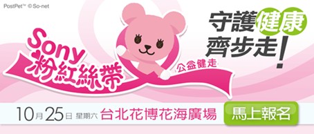 隨著國人癌症發生個案比例的快速提升,乳癌更位居台灣女性好發癌症的第一位,其發生原因在於現代人不良的飲食習慣及運動量少所造成,而現在女性在職場的比例也較以往高出許多,在工時長、工作量大及精神壓力的情況之下,讓罹患乳癌的女性人數更是逐年攀升。有鑑於此,Sony在台集團與財團法人台灣癌症基金會即將於10月份的乳癌防治月前,共同發起「Sony粉紅絲帶公益健走」活動,預計號召五千名關心健康的民眾,以及Sony在台集團旗下員工暨家屬參與,自圓山花博花海廣場出發,沿大佳河濱公園健走約五公里,期以健走行動來喚醒民眾對於乳癌預防的重視,並加強運動防癌之概念。