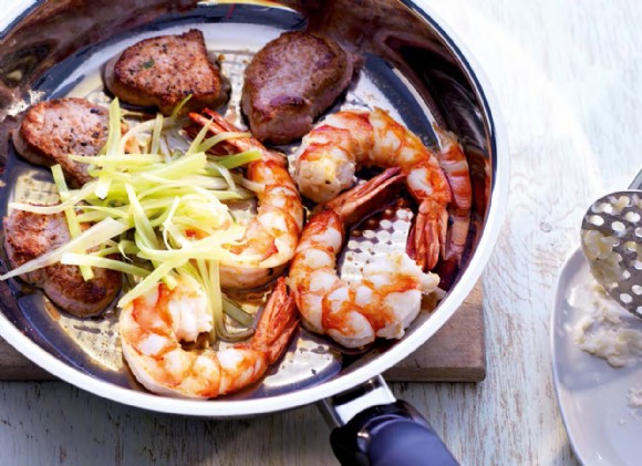 因為Fissler的專利 「烹飪之星」鍋底,讓熱能更均勻的散布,所以煎牛排只要5分鐘就可以上桌,而且煎牛排完全不用油。首先先熱完鍋,再把2-3公分厚的牛排放在蜂巢鍋面上,如煎有油花的牛排,會把牛肉本身的油脂給逼出來。