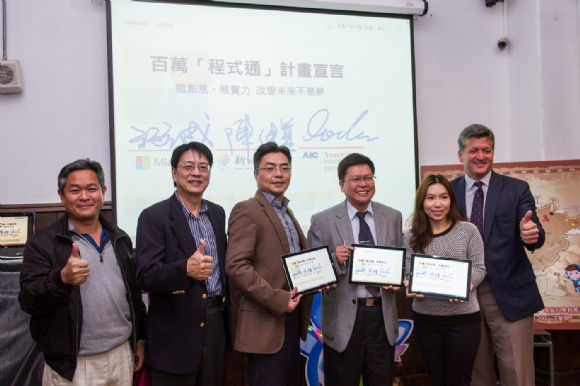 原來寫程式這麼簡單?變身科技新貴不再是遙不可及的夢想,新北市教育局、台灣微軟與美國創新中心(AIC)今(7)日攜手啟動百萬「程式通」計畫,透過邀集全民一起來學習寫程式的具體行動,響應美國「電腦科學教育周」(12/8-12/14),同時藉由種子教師培育、提供免費程式開發教學軟體及程式教學課程,計畫一年內達成台灣超過百萬人學會寫程式的目標。新北市政府教育局率先將程式教學納入新北市境內中小學的資訊教育課綱,以輕鬆玩程式培養學童的邏輯思考、空間概念及問題解決能力,提升21世紀的全球競爭力,希望未來全台灣更多學校加入。