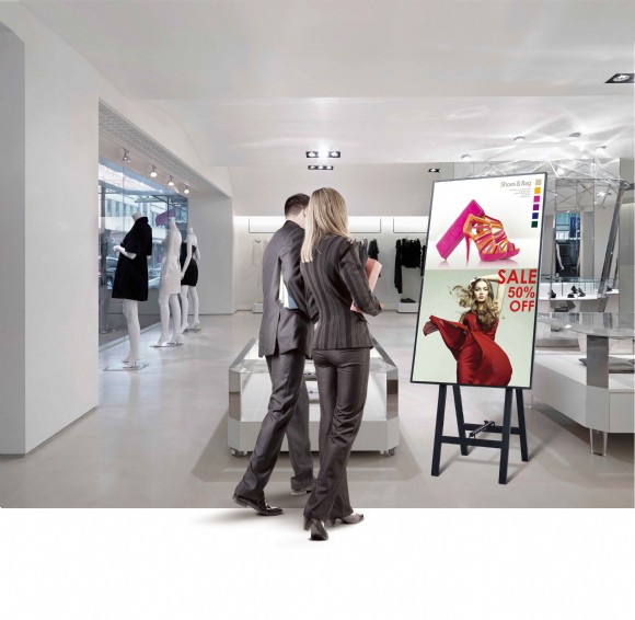 「立客來」商用電子看板可選用42”~55”不同尺吋的顯示器,搭配方便架設移動的固定立架,及利用簡易的多媒體編輯軟體,可將產品訊息、優惠活動等靜態圖片、動態影像做整體規劃設計,並可廣泛應用於一般精品服飾店、餐飲店用於發布商店訊息以招攬路過顧客。此外,更可運用在會議、婚宴等場地,清楚的導引來賓、公告場次行程,或是將新人的婚紗照片放上供人觀賞,提供多元商業廣告應用。