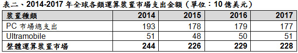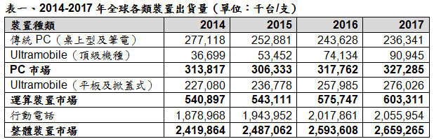 2015年全球Ultramobile出貨量(包括平板與掀蓋式機種)預計將達到2.37億台,較2014年增加4.3%。