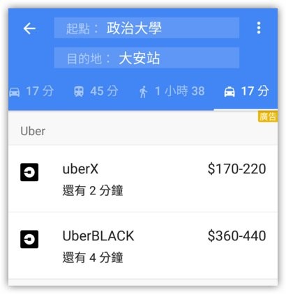 雖然在全球各地 Uber 都飽受各國政府交通單位排擠,就連台灣本地也加重對 Uber 司機的罰金,重則還會吊扣甚至吊銷行照;不過 Google Maps 在最近的更新版本中,加入 Uber 的整合。也就是在路徑規劃時,除了原本的駕車、大眾運輸、走路的選項外,新增了叫車的選項,除了可看到預估的行車時間外,還有不同的 Uber 車種、車資估計,當然,點入後就會直接開啟 Uber APP 進行更進一步的確認。