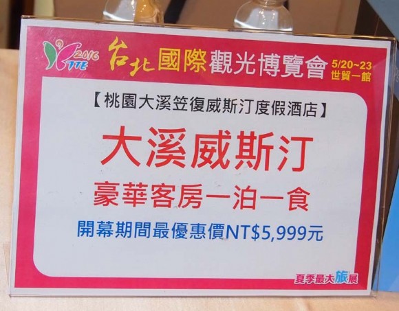 喜達屋旗下威斯汀酒店及度假村,在台灣的首家度假酒店-桃園大溪笠復威斯汀度假酒店,由知名企業笠復投資股份有限公司所投資興建。為迎接開幕以來首次參展,現場將推出一系列開幕以來最優惠價格,住房專案平均4,999元起,餐飲最多可享7折優惠。