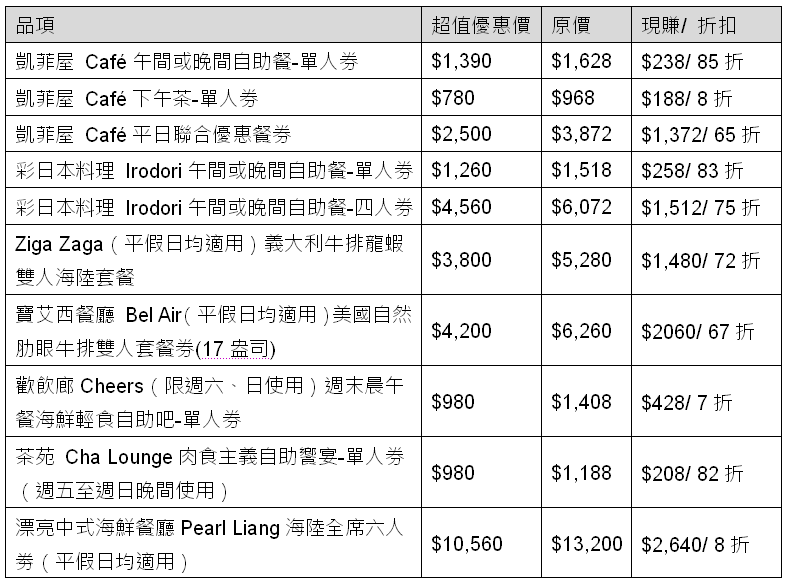 台北君悅酒店(世貿一館,攤位編號510)今年集結超人氣頂級自助餐廳「凱菲屋」、精緻和風自助饗宴家首選的「彩日本料理」、專精頂級歐陸料理的「寶艾西餐廳」、提供週末輕食早午餐的「Cheers」等7家館內餐廳,聯合推出10款最低65折起的優惠餐券。