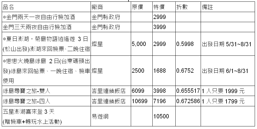 金門縣政府指出只要購買平日出發(周日至周四)的「每人2999元(兩天一夜)體驗金門遊」及「每人3999元(三天兩夜) 探索金門」套券,就可一遊金門,套券中還有金門地區15家特產可享受購物、租車多項折扣優惠。