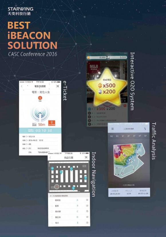天奕科技總經理 陳宗逸表示:「本次天奕科技展示的新一代 AI 銷售平台能大幅強化商場廣告媒體傳達率及銷售人員的推銷成功率,而透過 iBeacon 微定位技術還可為商場客製化各類專屬應用,如『室內導航』引導顧客快速到達購物點、『行動導購』增加商品觸及率及客單價、『互動娛樂』創造商場樂趣及差異化、『人流分析』提供商場冷熱點數據及顧客行為模式,採用天奕科技解決方案的商場平均可增加 50% 的到店人數及 30% 的轉化率。」