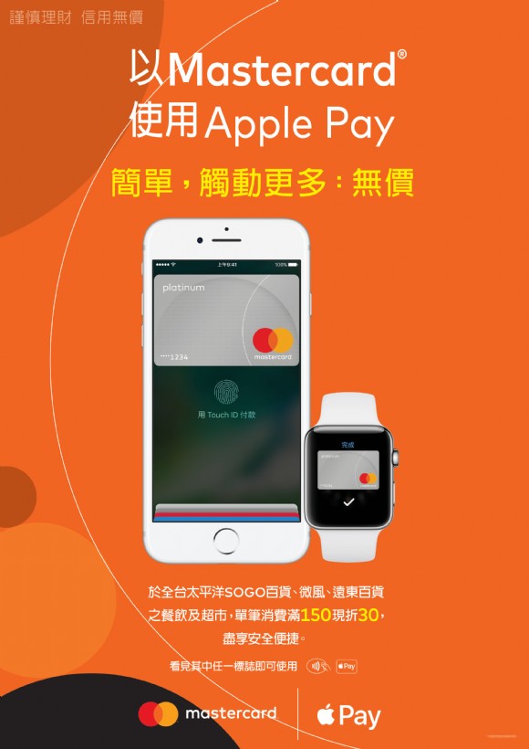 萬事達卡和全台太平洋SOGO百貨、遠東百貨和微風廣場合作提供優惠活動,自Apple Pay正式上線至2017年6月30日止,以MasterCard 透過Apple Pay於全台太平洋SOGO百貨、遠東百貨和微風廣場(微風廣場、微風信義、微風松高、微風南京、微風台北車站、微風台大醫院、微風三總商店街)的餐飲或超市,進行交易,消費單筆滿150元,立享現抵30元優惠。(此優惠每人每日每卡現抵壹次,活動期間限量20,000份,送完為止)