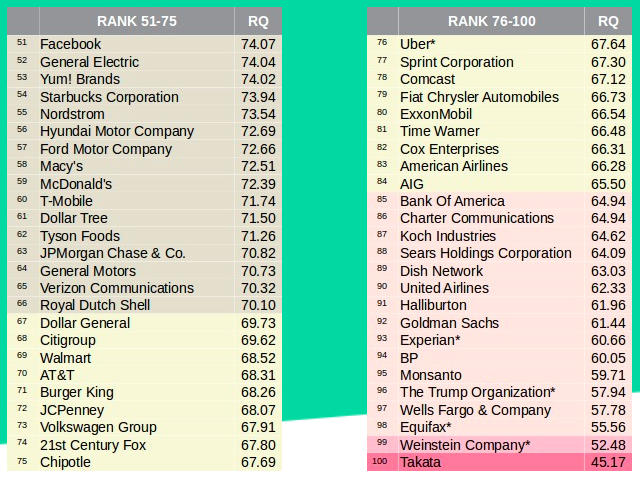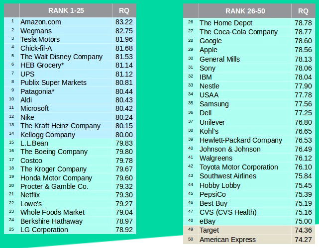 美國市調公司 Harris Poll 公布 2018年 Reputation Quotient 企業聲譽商數排行,這是根據民意調查所計分的結果。前百名排行如下,Amazon 奪冠,連鎖超市 Wegmans 居次,電動車的 Tesla 則是第三名。微軟公司由去年的第 20名爬升到 11名,Netflix, LG 分居第 21, 25名,Apple, Google 名次則都比去年下降,都跌出 25名外。