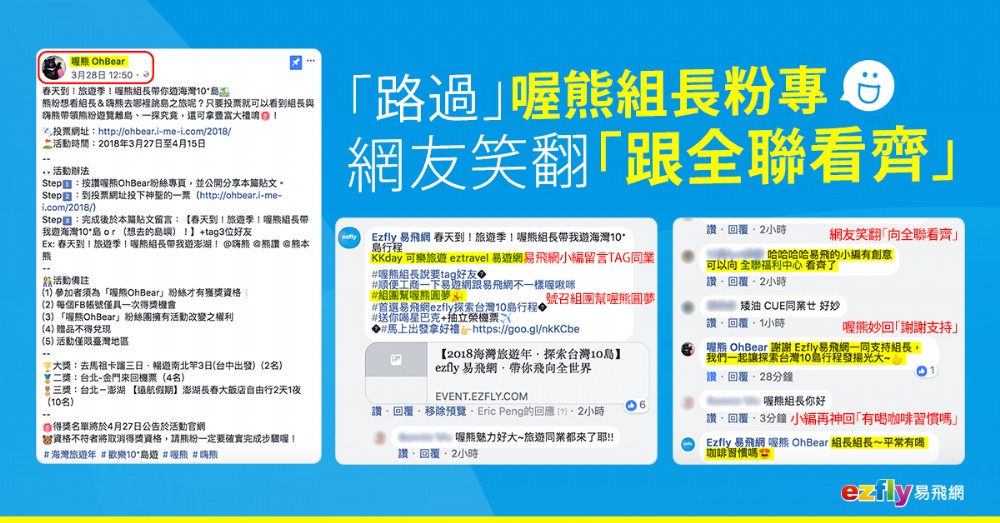 這篇貼文是在「喔熊組長OhBear」臉書官方粉絲頁中的置頂文章,喔熊於3月28日po出此篇任務投票活動,凡「熊粉」留言分享並TAG三位好友即可參加抽獎,最大獎祭出馬祖南北竿免費3日遊2名,共吸引超過1,500名粉絲按讚留言搶好康!而國內旅遊電商龍頭易飛網ezfly官方粉絲頁小編也沒缺席,不只「亂入」留言要請喔熊組長喝咖啡,還趁機「置入」自家探索台灣10島產品,也讓易飛網首度推出的海灣旅遊行程搶先曝光,幽默行銷成功引發話題。