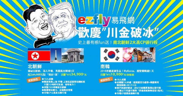 歡慶「川金破冰」易飛網ezfly沒缺席!美國總統川普與北韓領導人金正恩於本月12日完成歷史性的「川金會」,全球隨即掀起「北韓熱」,但受限團費居高不下,市場詢問度始終低靡,國內旅遊電商易飛網ezfly 宣布推出獨家北朝鮮5日行程,不只團費「有感」大降價到「3字頭」,更創業界首例搭乘上海-平壤往返直飛包機航班,僅2小時就能快速飛抵平壤,同時也祭出南韓暑假「萬元」行程,10人成團、包吃住玩, CP值高到破表!