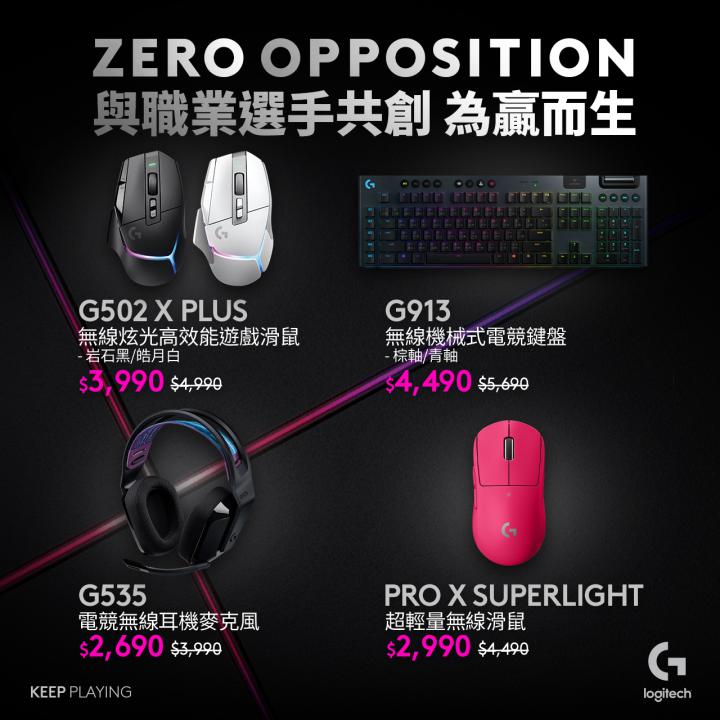 為和所有玩家共創全勝局面的熱情,即日起至 4 月 28 日期間祭出極致下殺優惠,消費者至 Logi 旗艦館消費可享最低 68 折優惠,PRO X SUPERLIGHT 超輕量無線滑鼠優惠價只要2,990 元(原價 4,490 元);G913無線機械式電競鍵盤優惠價4,490元(原價 5,690 元);G502 X PLUS無線炫光高效能遊戲滑鼠優惠價3,990元(原價4,990元);G535電競無線耳機麥克風優惠價2,690元(原價3,990元),成就完美電競生態鏈,打造為贏而生的戰鬥領域。更多活動請至:https://reurl.cc/3XL91V。