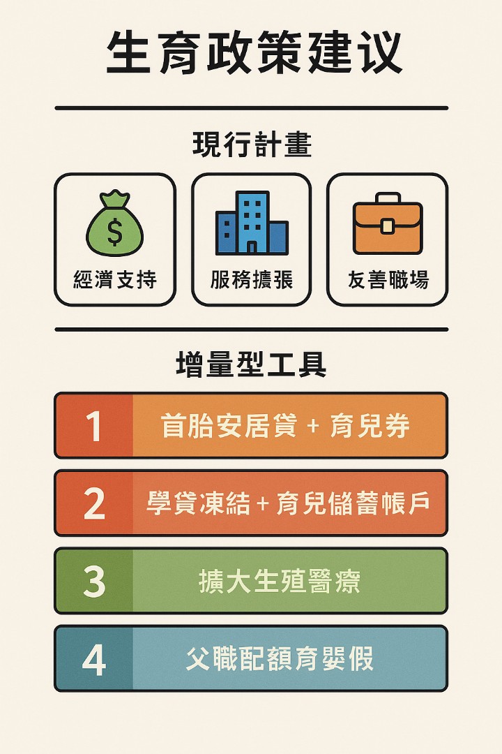 - 以上增量型工具能與現行政策形成「疊加效應」──同時壓低直接、結構與時間成本,將「想生」真正轉化為「敢生、能生」。