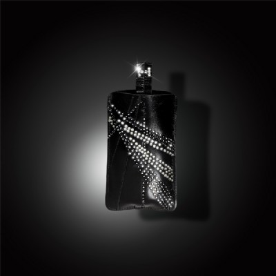 男手機套一襲觸感精細的黑色皮革,大膽呈現沉穩紳士般的翩翩風度,身前宛如流星飛劃而過的三排水晶拼綴,突顯出男性慣有的不羈個性。