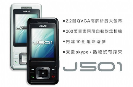 ASUS推出1.66公分超薄滑蓋的多媒體娛樂手機─ASUS J501。2.2吋大螢幕,不管是瀏覽影片、照片及手機內容,都有精緻細膩的視聽感受。ASUS J501更具備獨門法寶,可透過藍芽連結電腦,撥打Skype網路電話,精打細算省下荷包錢。另外,Micro SD卡擴充、2百萬畫素自動對焦相機、MP3、10組動感遊戲及支援QR Code等實用功能也都一應俱全。