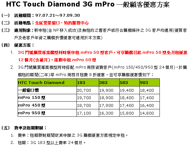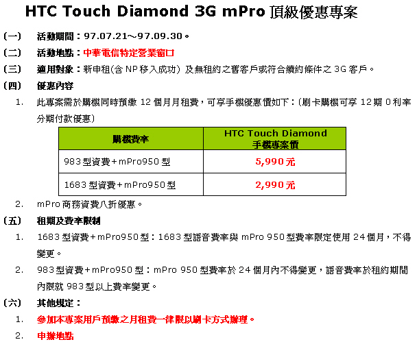(1) 「HTC Touch Diamond 3G mPro頂級專案」:消費者自7月21日起到9月30日為止,凡到中華電信特定營業窗口申租中華電信3G行動門號1683型資費搭配mPro 950型方案,並於申辦時預繳一年期的語音及mPro資費金額,即可以超低價新台幣2,990元購得HTC Touch Diamond手機,並享mPro商務月租費8折。