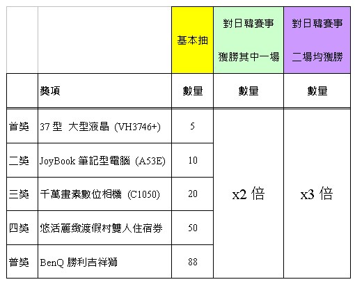 只要於活動期間(7月11日~8月25日止)於全台BenQ商品零售通路門市,凡購買BenQ商品(不限指定機種),即可參加3C好禮大抽獎,獎項包含大型液晶、筆記型電腦、千萬畫素相機、悠活麗緻渡假村雙人住宿券等好禮! 若中華棒球隊超韓勝日,BenQ慶祝精采賽事獲勝,抽出獎項回饋再加倍!
