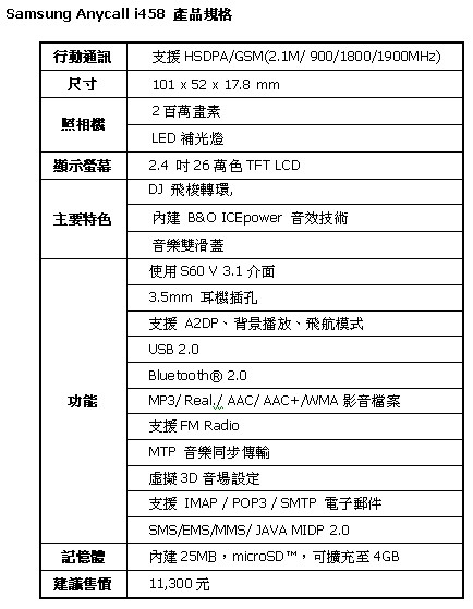 Samsung Anycall i458 產品規格