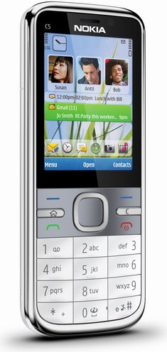 Nokia C5外型由不銹鋼打造而成,除了擁有經典不敗的外型與流行輕巧的絕佳設計,清晰的 2.2 吋螢幕支援千萬畫素,為檢視圖片、影片及瀏覽網路的絕佳手機,配上精心設計的按鍵配置造型流暢、反應敏捷,可讓人獲得愉悅的使用體驗。內建3.5mm標準音源插孔、320萬全幅對焦相機、LED閃光燈、相片編輯器,讓生活享樂不停歇。不僅外型卓越,Nokia C5還可以透過Nokia Messaging服務取得你最愛的電子郵件服務,例如Ovi Mail、Hotmail、Gmail、Yahoo!Mail,甚至在通訊錄整合了Facebook功能,快速查看朋友動態、隨時隨地輕鬆分享你的狀態。