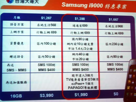 Samsung GALAXY S i9000將於6月底在台灣大哥大myfone及三星指定智慧型手機專賣門市同步上市,16GB單機價22,900元。獨家搭配台灣大哥大資費,專屬配件全面8折,月繳1,398元(通通省699+行動上網699),手機專案價只要1,990元;月繳1,667元(在地生活968+行動上網699),手機0元,另外加送免費通話分數鐘、股市達人、ezPeer+、TV隨身看、PAPAGO!導航軟體(市價999元)等加值服務。