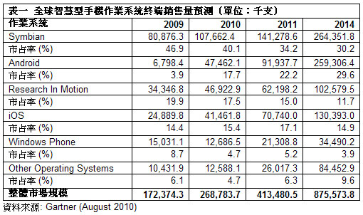 另外,據Gartner統計,2010年第二季,智慧型手機終端銷售量達6,160萬支,較2009年同季大幅成長50.5%。Symbian、RIM、Android和iOS等四大手機手業系統,合計約占全球智慧型手機作業系統市場的91%,較2009年同期增加6個百分點。