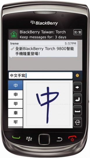 BlackBerry Torch是首部支援中文手寫輸入功能的BlackBerry智慧型手機,用戶可在同一介面上寫上繁簡中文、英文、符號及數字,使用者無須按筆順書寫,憑藉高識別技術及字詞搭配功能,提供不同的中文片語建議,文字輸入更快速簡易。