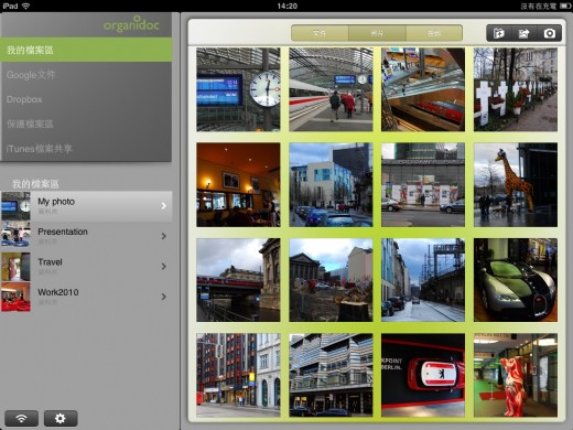 OrganiDoc HD能夠辨認存入的檔案類型,自動將檔案分類管理,分開管理文件、圖片、視訊。除了三種類型的介面皆以最佳瀏覽的方式呈現之外,更增加Cover Flow的瀏覽介面和預覽視窗,提高使用者搜尋檔案的效率,達到檔案管理系統的最終目的。