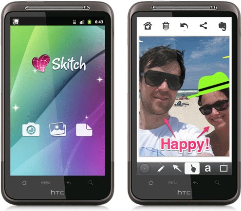 與此同時,Evernote也宣佈推出Skitch Android版,此為第一款Skitch的行動應用程式。Skitch Mac與Android版操作簡易有趣,可讓使用者螢幕截圖、註解塗鴉及分享圖像。註記完成後,即可與分享至 Evernote及其他應用程式與服務。