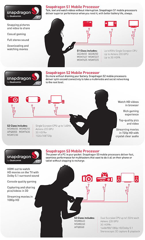 Snapdragon S3等級處理器可提供高於S2等級兩倍與高於S1等級四倍的圖形處理效能。S3等級處理器內含每具運算速度高達1.5 Ghz的雙核Scorpion CPU。