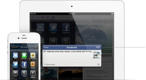 繼 iOS 5 整合 Twitter 後,iOS 6 則將 Facebook 整合到各個 App 內,例如可以直接由相機 App 或相片 App 直接將照片分享到 Facebook,也可將 Maps上的位置分享,或是立即張貼 Game Center 的最高分數,而這些也都可透過 Siri 進行。只需登入 Facebook 一次往後並可快速進行分享。