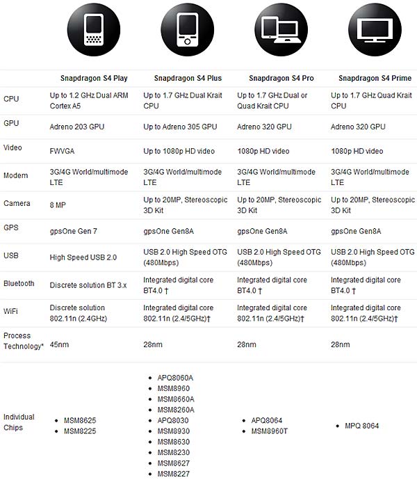 驍龍S4 Pro是目前高通已商用化驍龍處理器中功能最強大的。高通全球副總裁沈勁指出驍龍S4 Pro 四核心處理器的三大優勢為:第一是「運算速度」,由於採用Krait CPU微架構,進而增強性能以及電源效率表現。第二,「圖形處理」優勢,首次推出的Adreno 四核心320 GPU為網頁流覽、遊戲、導航、畫質顯示上,提供使用者卓越體驗。第三是「功耗管理」的能力,其28奈米製程以及非同步多核心處理幫助晶片獨立運作,降低功耗且更具人性化。