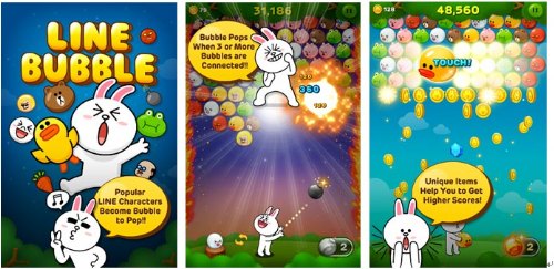 在LINE BUBBLE射擊益智遊戲中,受歡迎的LINE貼圖人物化身為泡泡。由高人氣的貼圖人物「兔兔」擔任主角,LINE BUBBLE這款全新的休閒遊戲可帶給玩家無與匹敵的遊戲趣味,只要在泡泡掉到底下前將三個或以上的泡泡連成一列並戳破即可得分。玩家們可從熊大、饅頭人和Sally化身而成的多種泡泡中感受到遊戲的樂趣,也可以使用遊戲贏得的代幣購買多種道具以獲得更高分。
