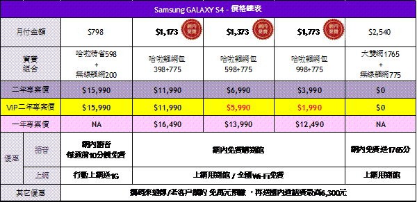 ‧ 白金會員最高折$2000限5/31前白金會員申辦3G哈啦990/998+無線飆網775型搭配Samsung GALAXY S4 (16G)享手機專案價折價$2,000優惠,需簽約2年,若申請調降資費或取消申裝,視同違約應支付違約金,白金會員與續約資格以遠傳系統為準.