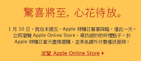 每年一度的 Apple 特購日將於本週五(2014/1/10)登場,就以往的經驗,Apple 會將許多舊版產品(iPhone, iPad, Mac/MacBook 以及配件等) 特價出清(僅限線上購物),有興趣採購 Apple 產品的網友可在這天密切注意 Apple Online Store 網頁: http://store.apple.com/tw