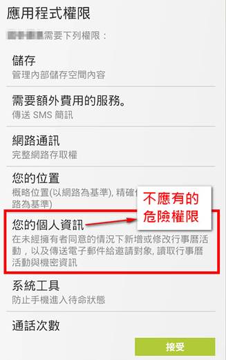 圖說:在下載APP時,務必要注意應用程式權限,有時陷阱就在應用程式權限內!如圖,此APP就暗藏著「在未經擁有者同意的情況下新增或修改行事曆活動,以及傳送電子郵件給邀請對象,讀取行事曆活動或機密資訊」的危險權限。