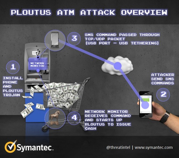 2013年底,賽門鐵克公布名為Backdoor.Ploutus的惡意軟體,可使用外部鍵盤輕鬆取得ATM中的現金,幾個禮拜後,此惡意軟體便已出現許多變種,並從原本墨西哥文版本翻譯為英文版本(命名為Backdoor.Ploutus.B),證明影響區域正向英語系國家蔓延。