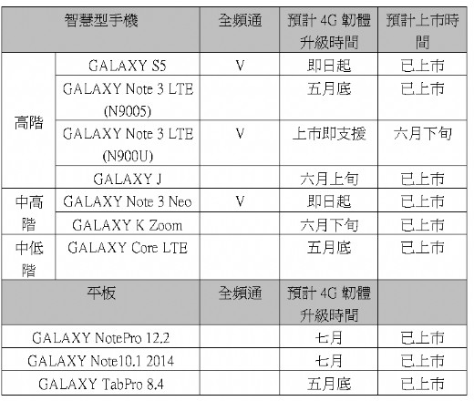註一:支援4G LTE的三星行動裝置之總數量和型號正面表列於表一,統計截至2014年5月30日止。