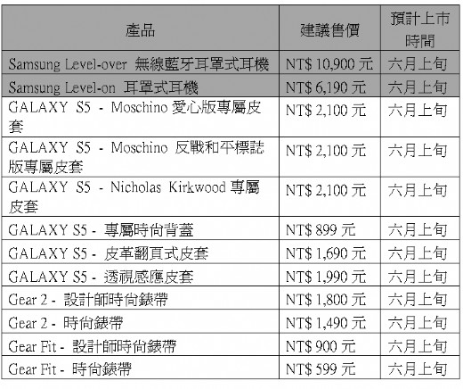 表三:三星行動裝置配件建議售價及上市時程(註七)