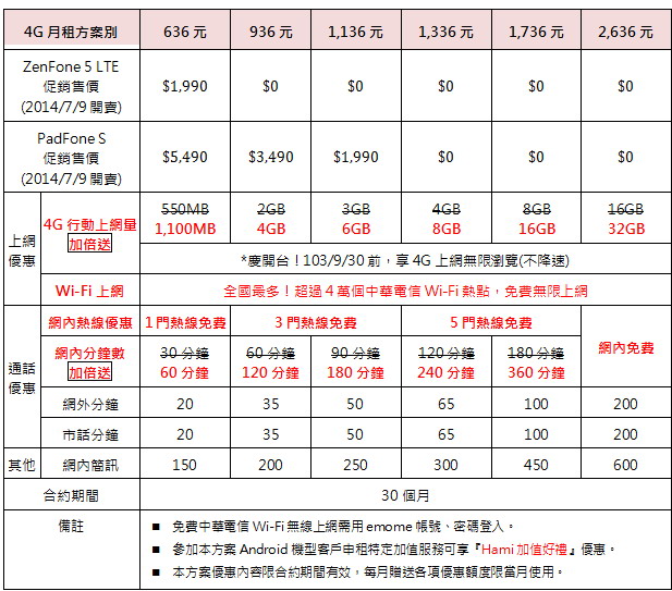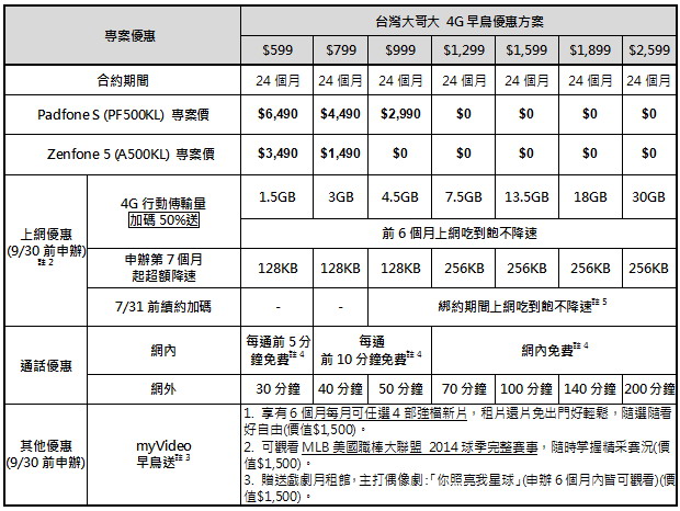 註1.活動至2014/09/30止,以上各專案皆須綁約24個月並搭配4G手機方案指定資費(部分專案綁約期間另依專案規定),須預繳。