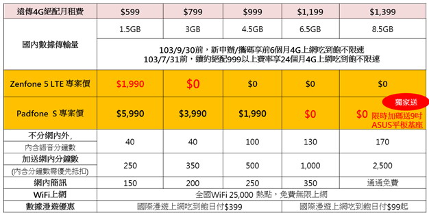 限2014/7/31前,申辦ASUS Padfone S搭遠傳4G絶配1399,須簽約30個月及預繳,限時加碼再送9吋ASUS原廠平板基座(價值$5000),遠傳保留活動修改及終止權利。