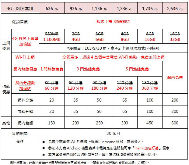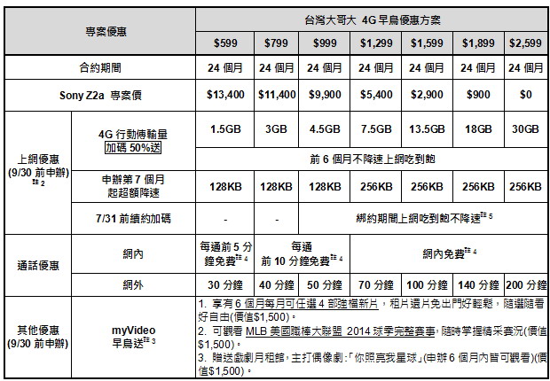 註1.活動至2014/09/30止,以上各專案皆須綁約24個月並搭配4G手機方案指定資費(部分專案綁約期間另依專案規定),須預繳。
