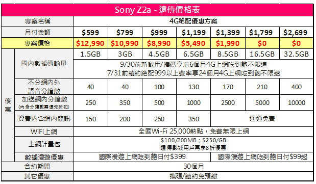 遠傳電信-Sony Z2a 4G絶配優惠方案
