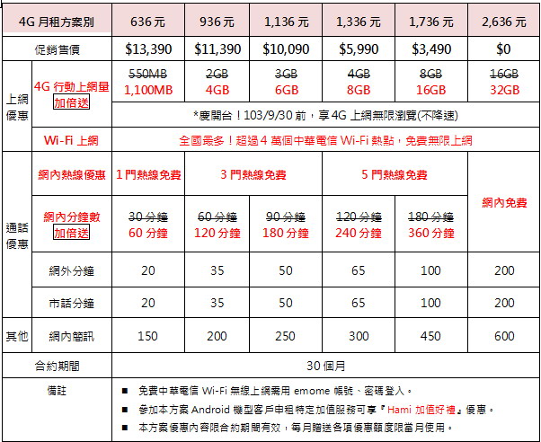 適用對象:新申辦(含NP移入)之客戶,及2G/3G符合續約(含無優惠租約)資格之既有客戶