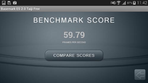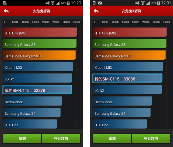 首先使用安兔兔測試,跑分 32878,介於 S4、S5 之間,用安兔兔X 跑分也差不多: